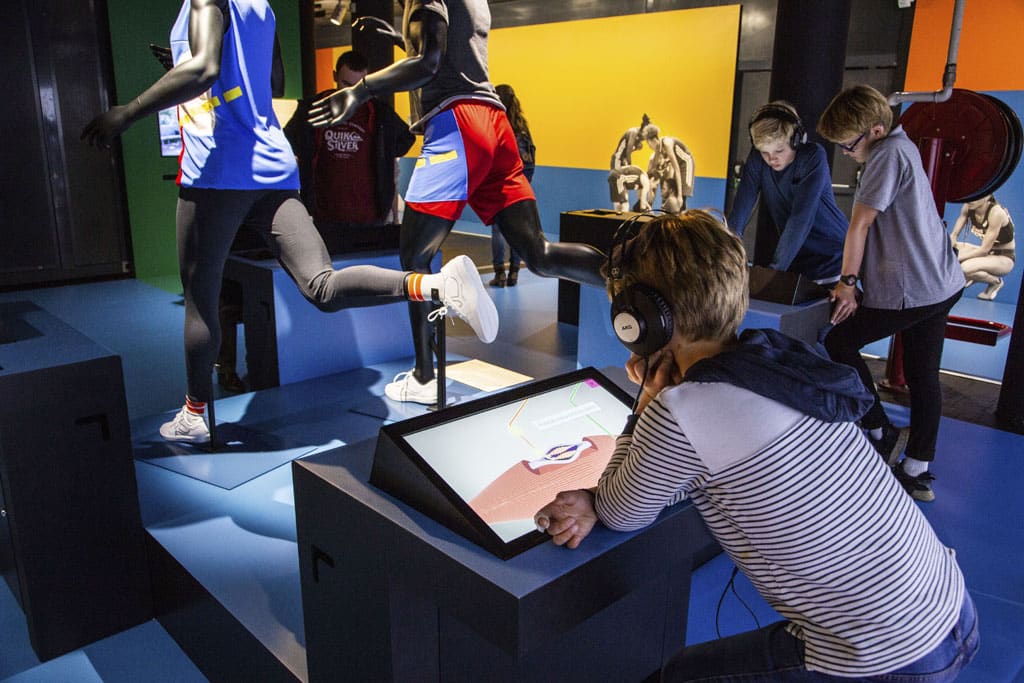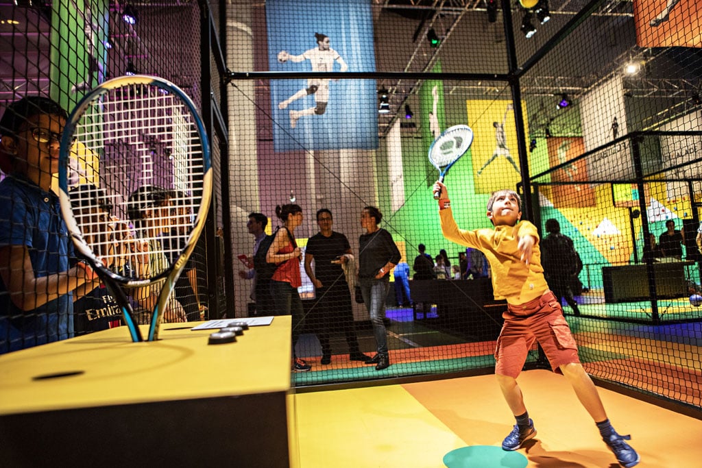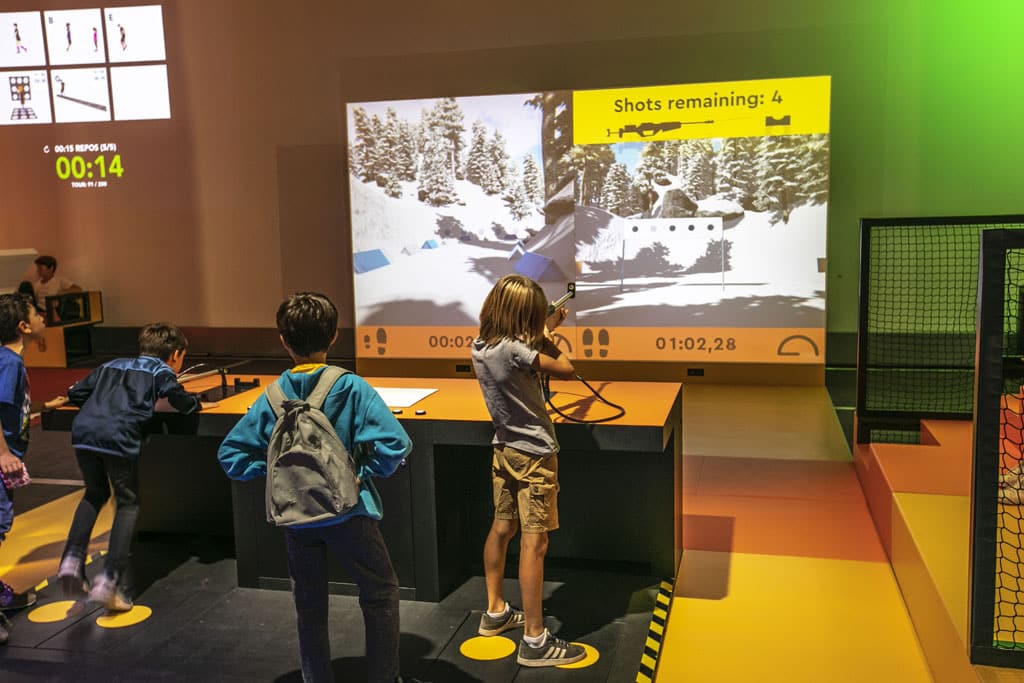 The first part is a multi-sensory interactive area, where visitors engage their minds and bodies. At each workshop, exercises combined with multimedia installations offer the public the opportunity to test their reactivity, balance, endurance, precision or coordination. Scientific explanations reveal the links between muscular, neurophysiological capacities and performance. Visitors can get physically involved by performing a simple technical gesture to compare it with those of experienced athletes.