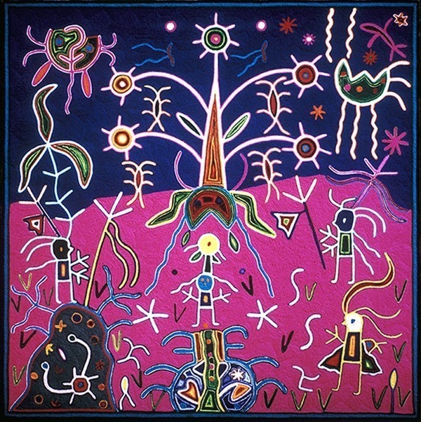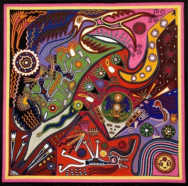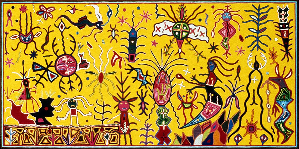 In 1970, Juan Negrín, a young philosopher and artist, visited an exhibition of works by Wixaritari artists outside the Basilica of Zapopan. In a few years, Negrín, together with his wife Yvonne, had forged strong bonds of friendship and collaboration with five Wixaritari artists and their families, traveling with them throughout the Wixárika territory. During the 1970s and 1980s, he sponsored the creation of a collection of wool worsted pictures of diverse sizes that would distinguish José Benítez Sánchez, Tiburcio Carrillo Sandoval, Guadalupe González Ríos, Juan Ríos Martínez, and Pablo Taizán de la Cruz as the masters of modern Wixárika art.
